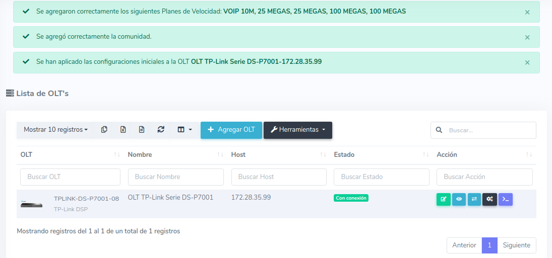 Después de aplicar las configuraciones iniciales, puede demorar entre 10-20 minutos en verse reflejados en su OLT.