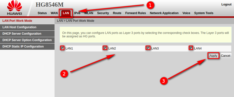 Entramos a la pestaña de LAN y habilitamos los puertos LAN que tengamos y damos aplicar.