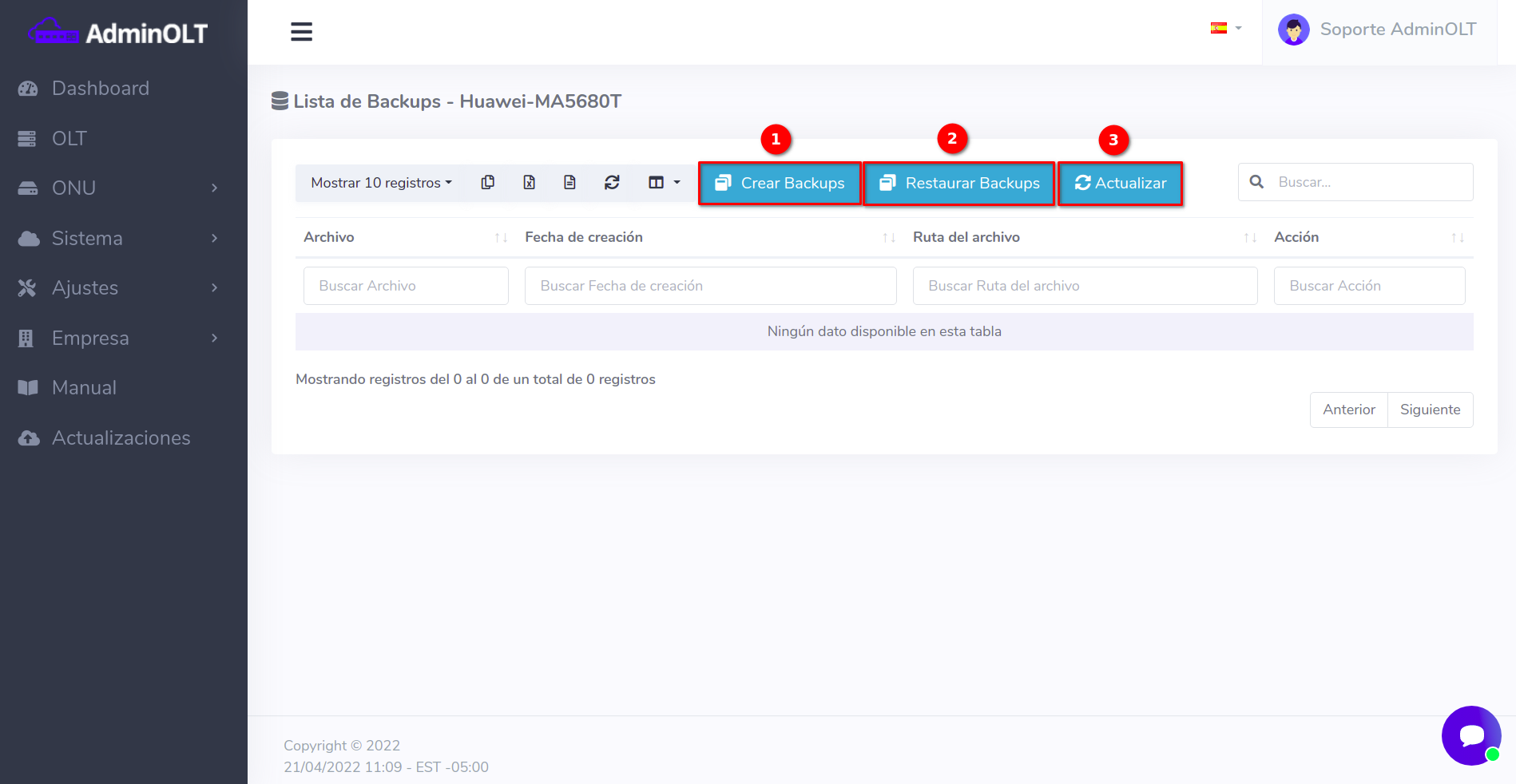 El sistema AdminOLT ofrece un acceso a un servidor FTP para el usuario. Esta información se configura en la OLT donde está última a base de los comandos específicos enviara la información al servidor antes mencionado. Si tiene dudas sobre donde conseguir estos accesos, puede consultar el siguiente manual. Usuarios FTP