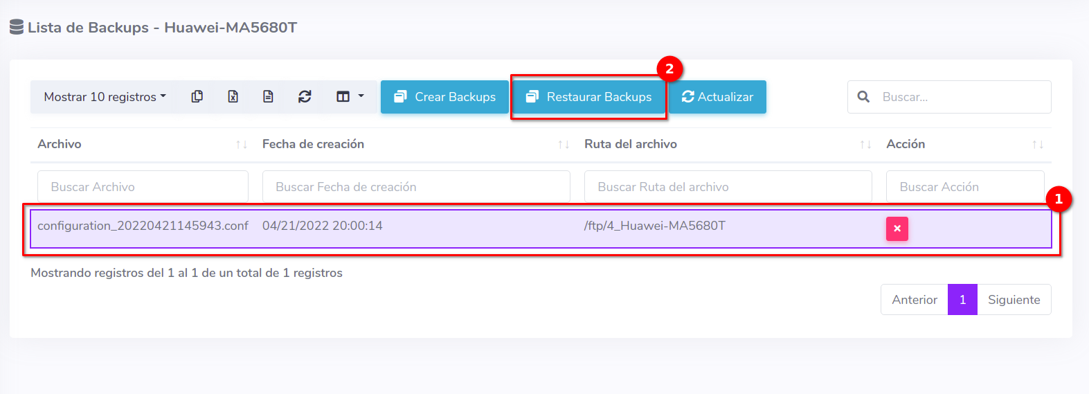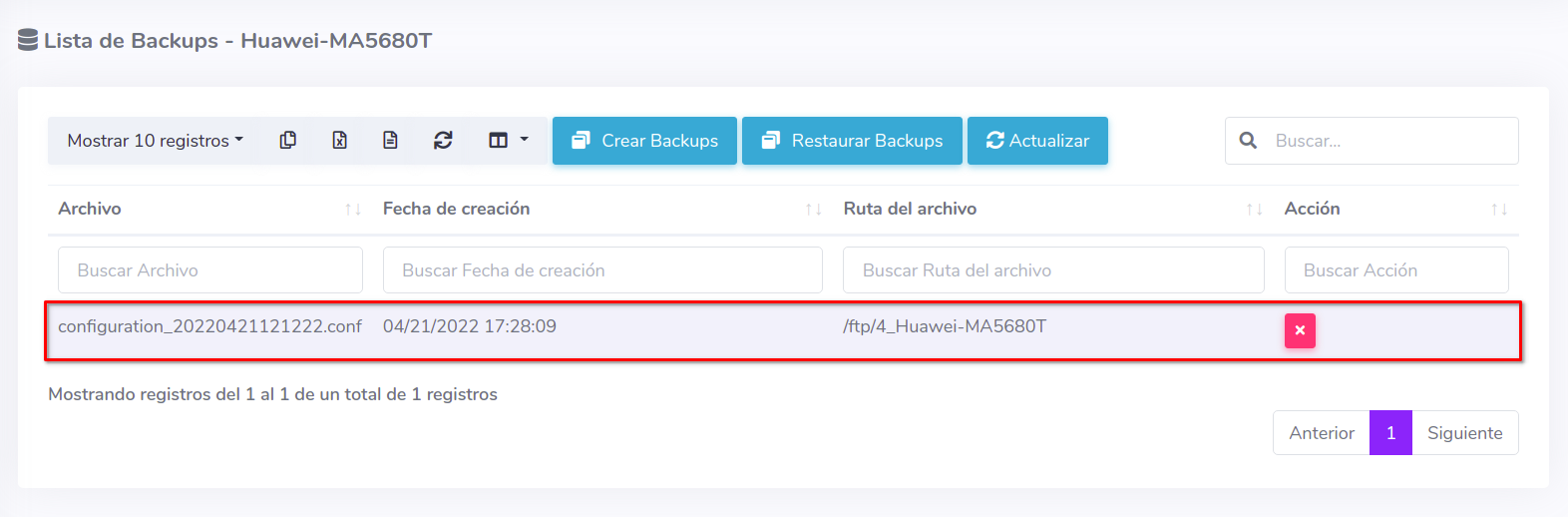 Al realizar estos pasos en su terminal, la OLT creara y mandara un respaldo en el servidor FTP de AdminOLT, el cual puede ser visualizado en la Lista de Backups
