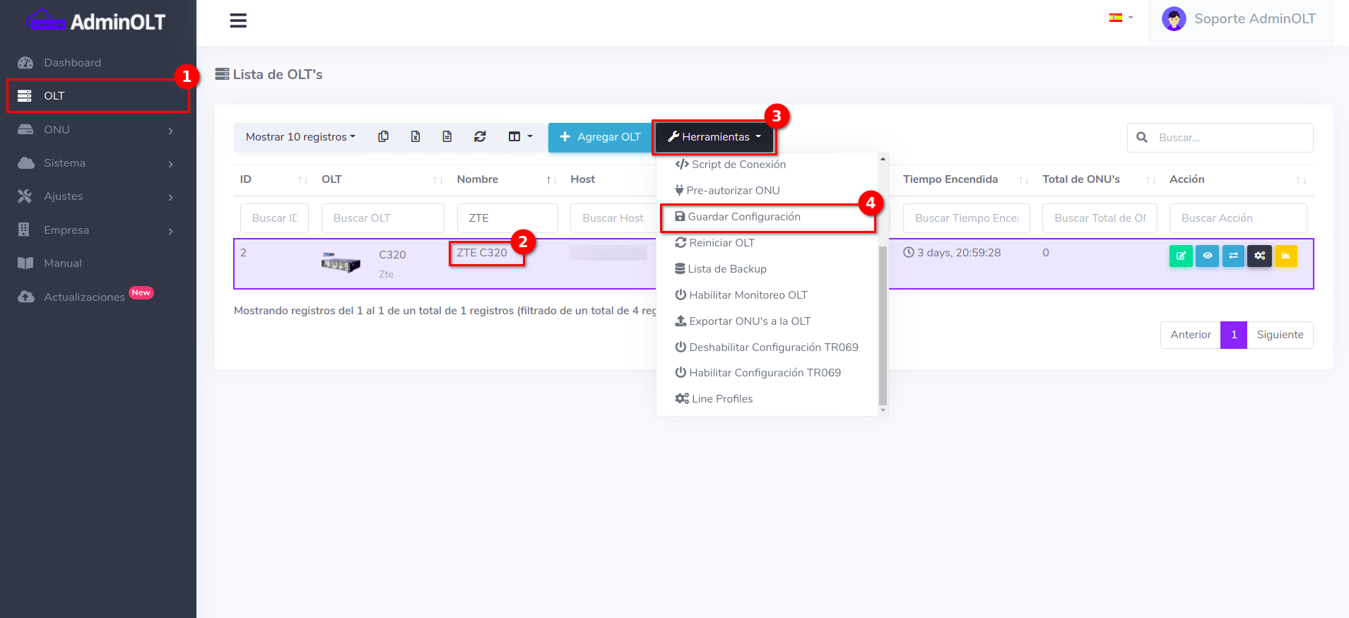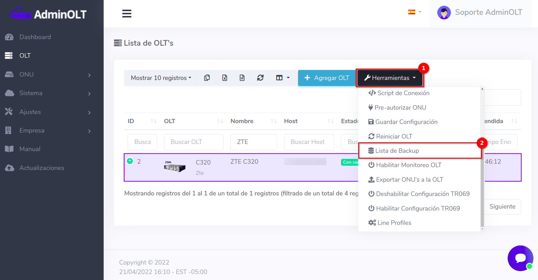 El sistema AdminOLT ofrece un acceso a un servidor FTP para el usuario. Esta información se configura en la OLT donde está última a base de los comandos específicos enviara la información al servidor antes mencionado. Si tiene dudas sobre como realizar este proceso, puede consultar el siguiente manual. Usuarios FTP