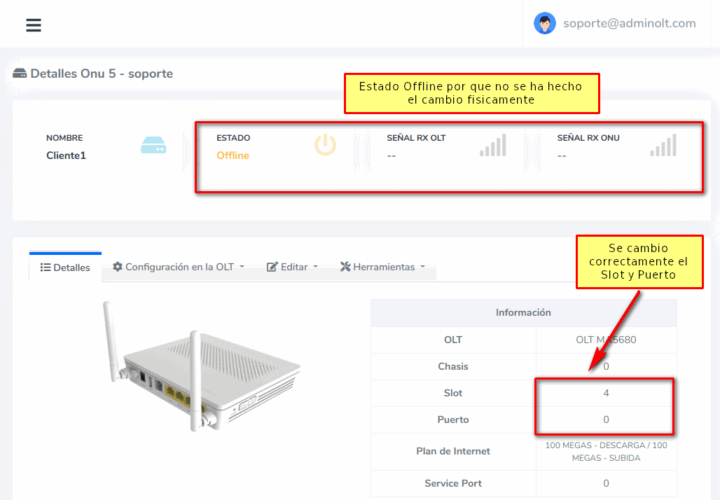 7 Cambiar ONU de Slot y Puerto fisicamente y verificar estado de la ONU
