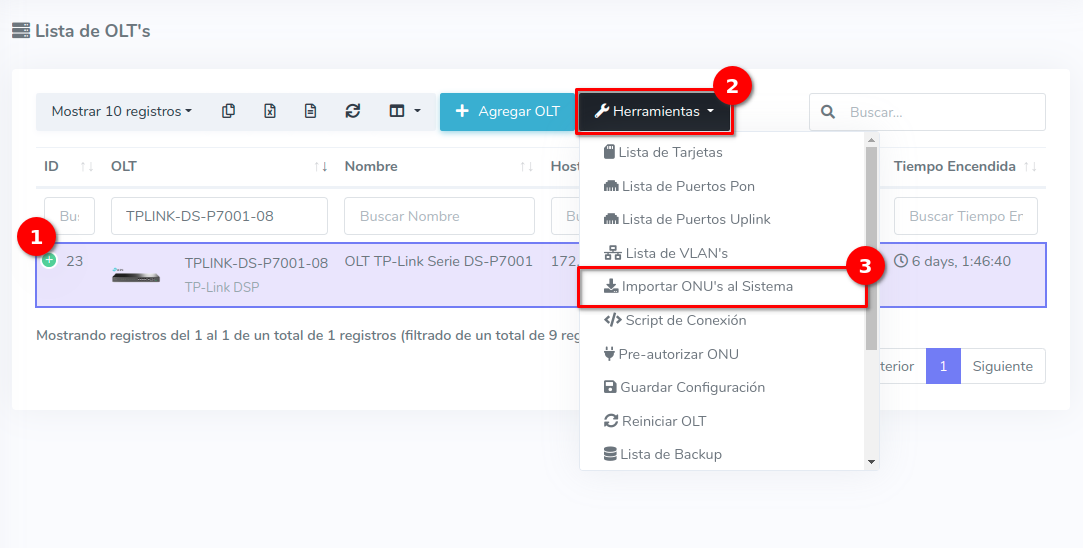 1En la Lista OLT's seleccionamos el equipo con el que trabajaremos para después ir a Importar ONU's al Sistema, que se encuentra en el botón con la leyenda Herramientas.
