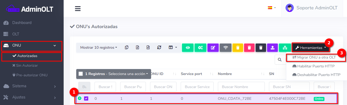 1 En ONU's > Lista de Onu's Autorizadas debemos escoger el equipo con el que se trabajará y seleccionar Migrar ONU a otra OLT que se encuentra en el botón con la leyenda Herramientas.