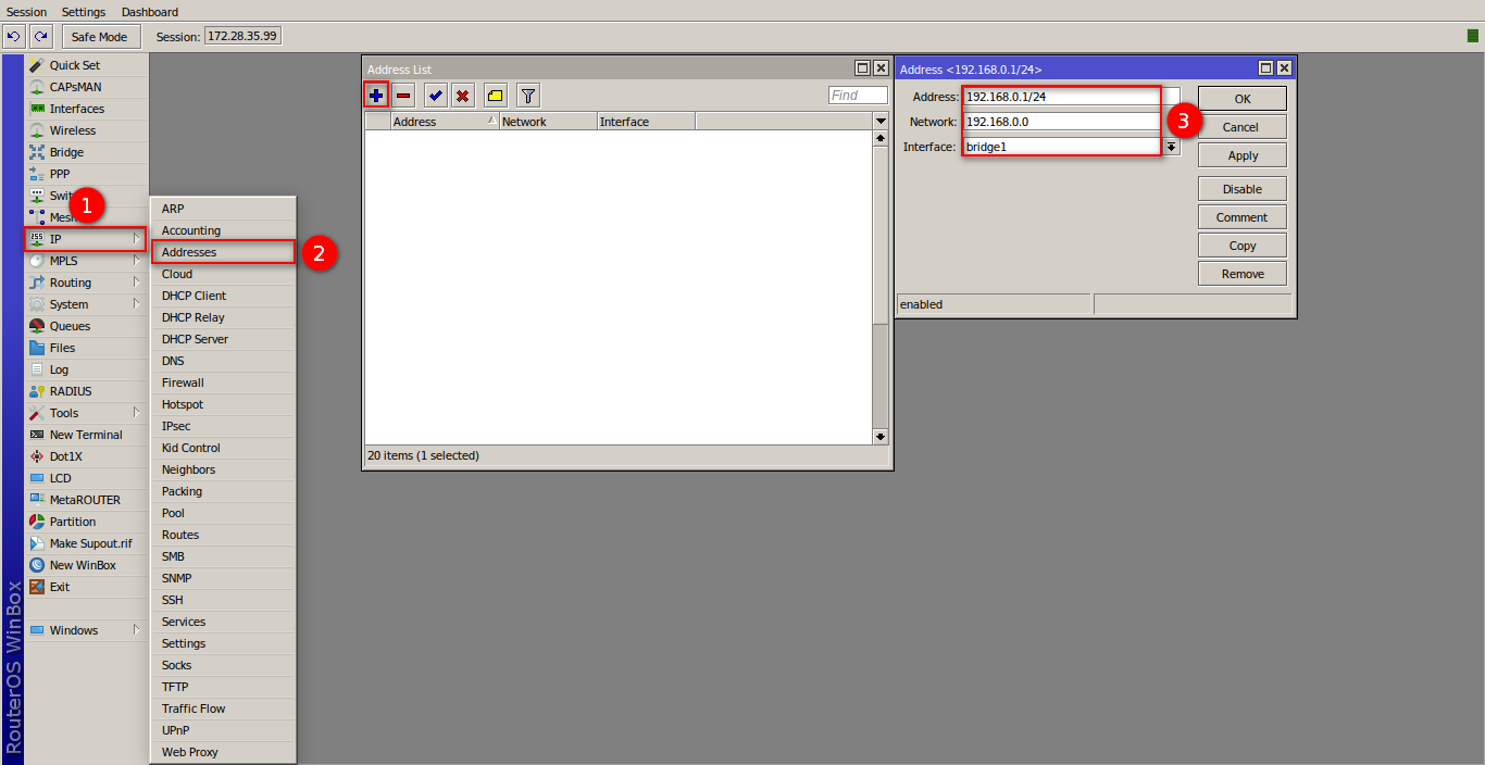 Nos dirigimos al apartado de Bridge en el menú de nuestro RouterBoard para generar la interfaz bridge1 y así poder agrupar los puertos que estarán trabajando en la red de la OLT.