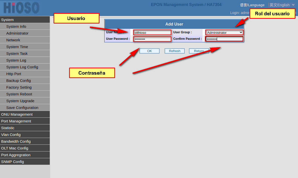 5 Creamos un usuario en la OLT, el cual nos servirá para conectarlo con AdminOLT