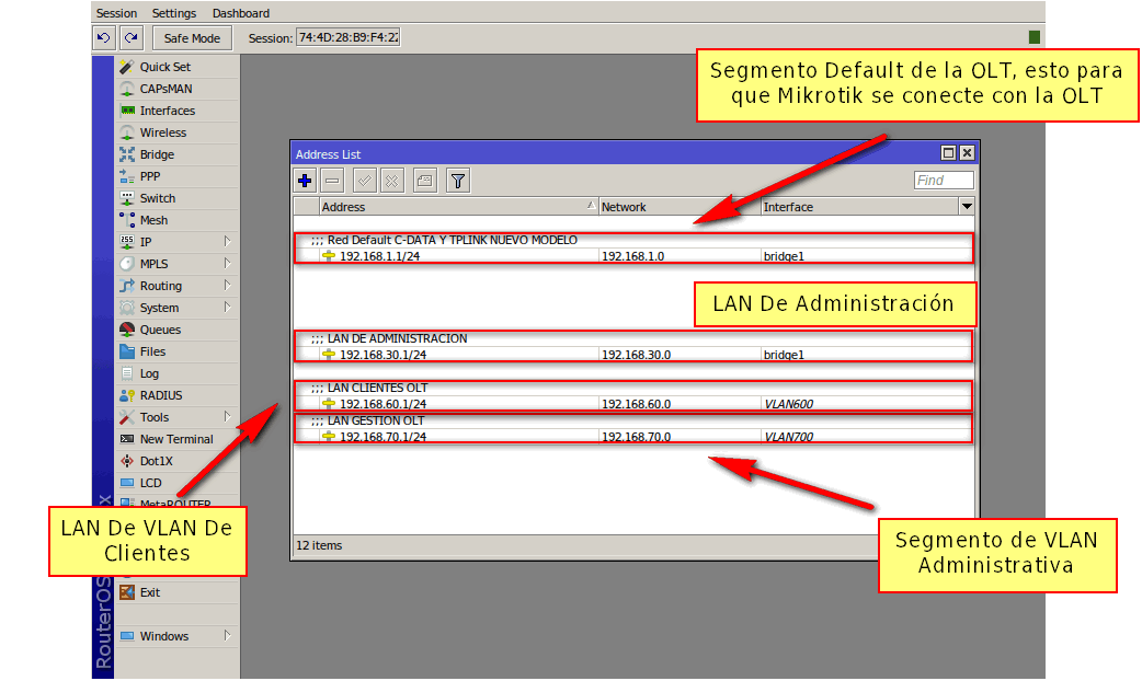 2 Debemos tener agregadas nuestro Vlan, LAN de Administración y LAN de Segmento de Clientes. Para más información puede leer el manual Configuración en RouterBoard MikroTik para OLT C-Data