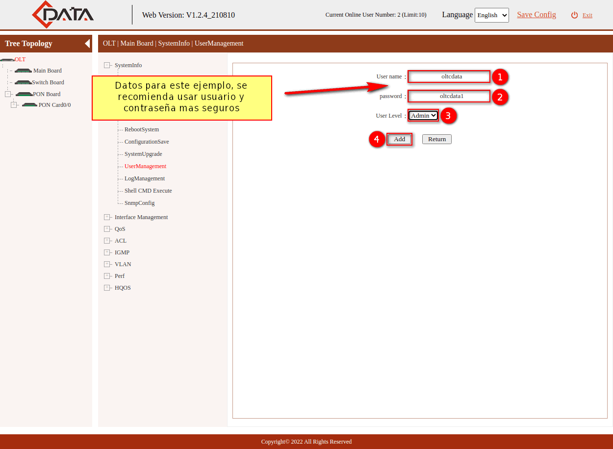 7 Creamos un usuario en la OLT, el cual nos servirá para conectarlo con AdminOLT