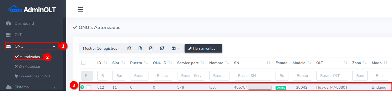 3Dirijase a la sección de ONU > Autorizadas y seleccione la ONU que acaba de autorizar.