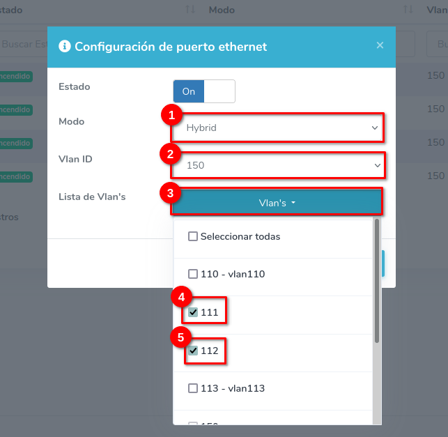 Coloque la opción modo en Hybrid, coloque una vlan en la opcion Vlan ID, seleccione las vlan's en la opcion Lista de Vlan's y guarde el cambio