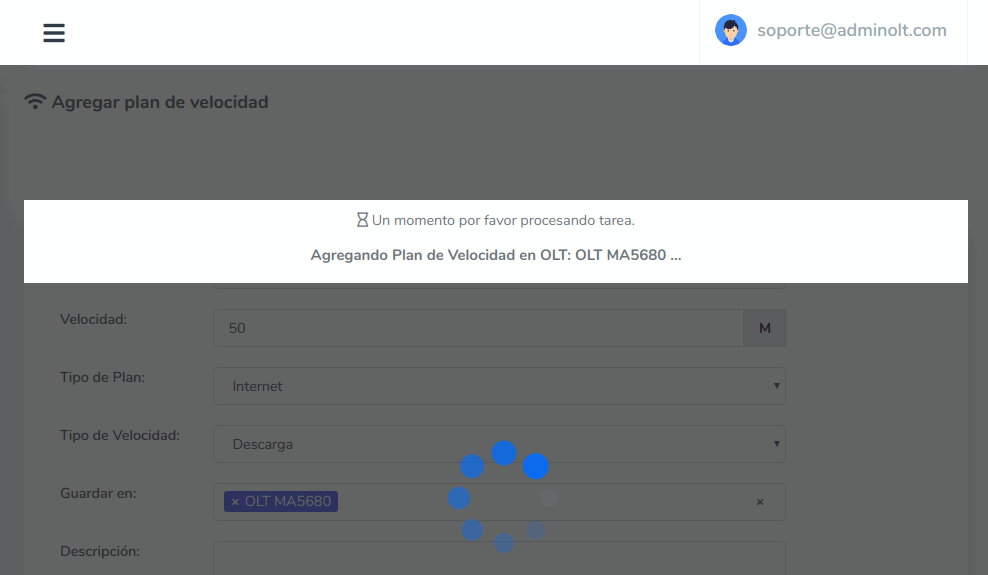 4 Una vez hayamos guardado la información AdminOLT se conectara con la OLT y agregara el Plan de Velocidad