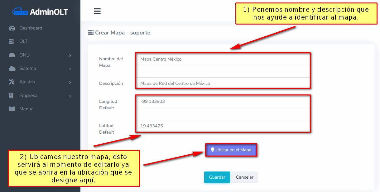 Para poder crear un mapa en AdminOLT es importante que antes haya hecho una serie de pasos que explican en el artículo ¿Como configurar mi AdminOLT para crear Mapas?, una vez hechas estas configuraciones puede seguir con las siguientes instrucciones.
