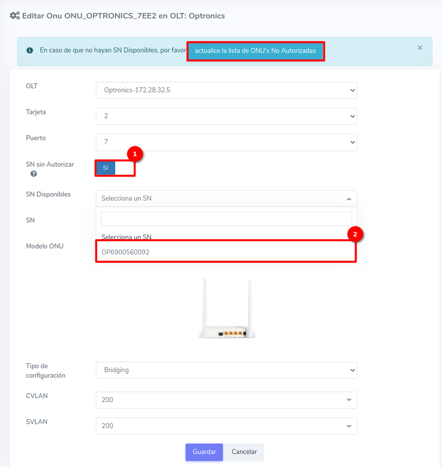 En AdminOLT podemos editar información de una ONU Autorizada en la OLT, supongamos que alguna de las ONUs que tenemos autorizadas en el sistema se estropea. Tomaremos como ejemplo esta situación para explicar el propósito de esta función. Así que en ese caso en AdminOLT al editar ONU por SN podemos tomar información de alguna ONU no Autorizada y usarla, sin perder la configuración inicial que teníamos.