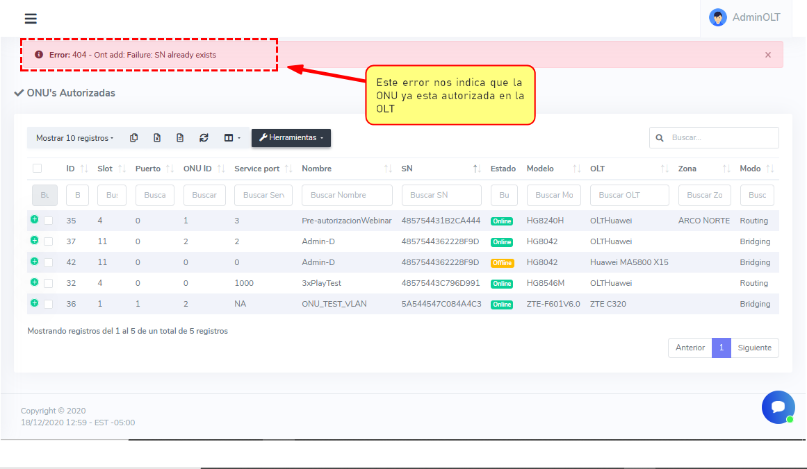 Si elimina manualmente la onu desde su OLT, el sistema no borrara el registro que se tiene en lista de autorizadas por lo que tendrá que eliminar la ONU desde AdminOLT para poder volver a autorizar.