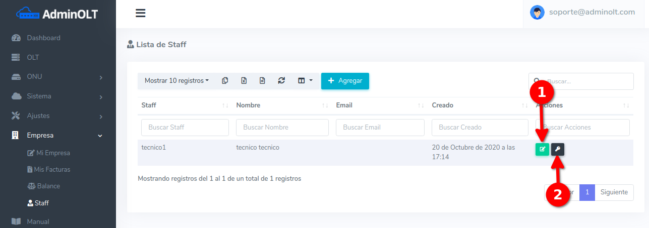 Si se desea crear un Staff para tener acceso a las OLT's o las ONU's lo podrá hacer desde aquí: