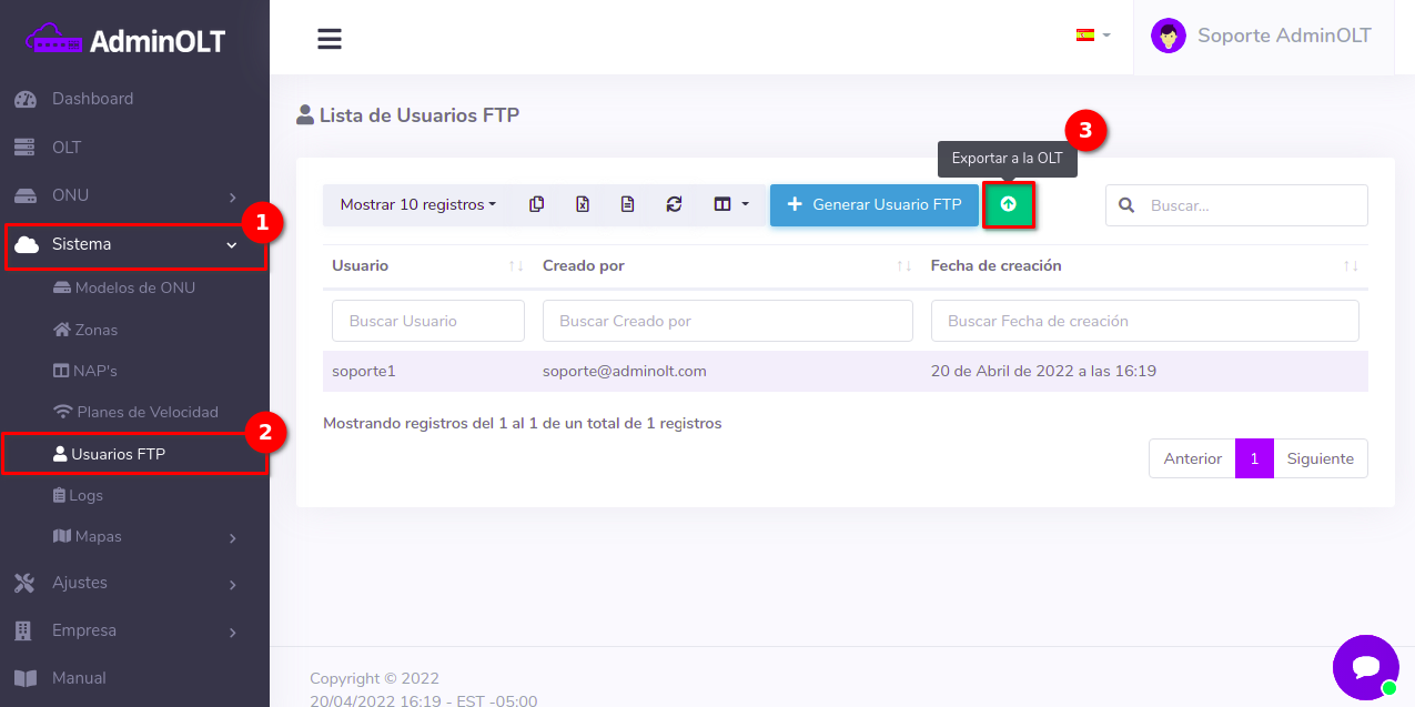Colóquese en Sistema > Usuarios FTP y de click en el botón con el mensaje Exportar a la OLT